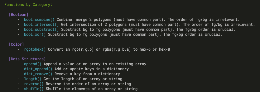 Avec richnou --helpextended il est possible d'avoir une vue plus complète de chaque fonction par catégorie.