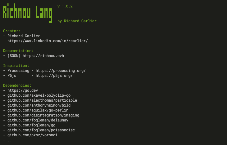 L'aide en ligne via la commande richnou --help permet d'avoir l'aide général.